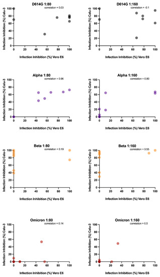 Finally, we examined if the limitations of the Vero E6 gold standard model could impact the characterization of neutralizing antibody response by correlating the infection inhibition results obtained in Vero E6 and Calu-3 (Figure 6). The Spearman’s correlation coefficient indicated an almost perfect correlation between the infection inhibition percentages at 1:80 sera dilution against the Alpha variant in the cellular models (r = 0.95, p < 0.001), whereas this value slightly decreased when using a 1:160 sera dilution (r = 0.8, p < 0.05). In contrast, no correlation was observed for the other three variants (p > 0.05) at any sera dilutions, indicating that neutralizing data obtained in Calu-3 did not significantly correlate with the data obtained in Vero E6.