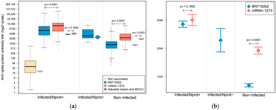 Antibody response against SARS-CoV-2 spike protein in a cohort of healthcare workers (HCWs). Subjects were grouped according to their infection and conservation status of antibody response against the nucleocapsid protein. Boxplots represent the distribution of anti-spike protein antibody quantification. (a) Upper and lower bounds of boxes indicate the 75th and 25th percentiles, respectively. Whiskers extend 1.5 times the interquartile range (IQR) from each extreme of the box. Diamond-shape symbols represent the adjusted group means of anti-spike protein antibody titer after statistical control for confounders, and their extension represents their 95% confidence intervals. (b) Adjusted means and 95% confidence intervals of the anti-spike protein antibody titer after statistical control for confounders in the vaccinated subject groups. Estimations were derived from a linear mixed-effect model in which the sample’s donor was modeled as a random effect to account for intra-individual variability, and were adjusted by sex, age, BMI, arterial hypertension, smoking habit and time interval from infection and/or vaccination to serology. Anti-spike protein antibody quantifications are expressed in a log2-scale.