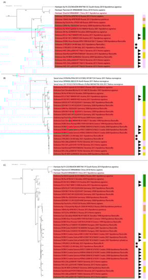 ML phylogenetic trees of the whole sequences for segments L (A), M (B) and S (C). The red box shows the viruses belonging to the specie Dobrava-Belgrade orthohantavirus. Original sequences are marked with a star, and sequences from countries neighbouring the study area are indicated with arrows. Coloured boxes represent the host in which the strains were detected, namely A. flavicollis (yellow), A. ponticus (orange), A. agrarius (green) and human infections (pink).