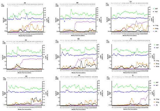 Dynamic of HEV markers and liver function tests in rabbits with chronic HEV infection. (A5,B4,C1,D2,E2,F3,G2,H4,I3) are the number of each representative rabbit. Detection of HEV RNA, HEV antigen, liver function tests, and anti-HEV antibody detection in nine representative chronically infected rabbits, one rabbit per group. Serum and fecal samples were collected weekly for immediate analysis. “-” for negative and “+” for positive of HEV RNA detection by RT-qPCR. Ab, antibody; Ag, antigen; ALT, alanine aminotransferase; AST, aspartate aminotransferase; B, blood; F, feces; HEV, hepatitis E virus; WPI, weeks post-inoculation.