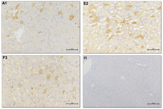 Immunohistochemistry analysis of HEV ORF2 proteins in rabbits’ liver tissues at 26 wpi. (A1,E2,F3) represents the liver tissues of three individual rabbits with chronic infection of HEV. (I1) is the liver tissue of the control rabbit in which the HEV infection was cleared within 8 weeks, but was kept in the study until 26 wpi.