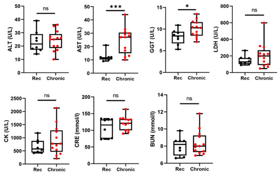 Serum biochemistry in euthanized rabbits at the end of the study. At 26 wpi, rabbits with chronic HEV infection (designated as “Chronic”) and rabbits who cleared HEV infection before 10 wpi (designated as “Rec”, serve as recovery control) were euthanized for extended analysis of serum biochemistry. ALT, alanine transaminase; AST, aspartate aminotransferase; BUN, blood urea nitrogen; CK, creatine kinase; CRE, creatinine; GGT, γ-glutamyl transferase; LDH, lactate dehydrogenase; ns, not significant. * p < 0.05, *** p < 0.001.