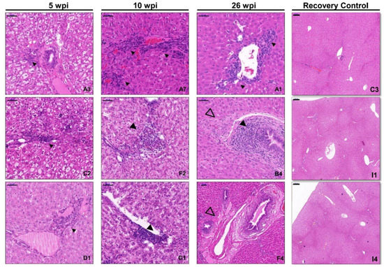 Dynamic of histopathology of liver tissue in HEV-infected rabbits. The number of each rabbit was indicated on the lower right of each image. Liver tissues were collected from HEV-infected rabbits at 5 (A3,C2,D1),10(A7,F2,G1), 26 wpi (A1,B4,F4) and from the recovery group (C3,I1,I4). Inflammatory cell infiltrates and hepatocyte necrosis were found (arrowhead) in all tissues and progressed as infection proceeded. At 26 wpi, chronic inflammatory cells infiltrate the portal area, blood vessel walls thickening associated with fibrosis (empty arrowhead) and local hyaline degeneration was found. No obvious lesion was found in the liver tissues of the recovery group. HEV, hepatitis E virus; wpi, weeks post-inoculation. Bars in the images of 5 wpi, 10 wpi and 26 wpi indicate 50 μm. Bars in the images of recovery group indicate 200 μm.