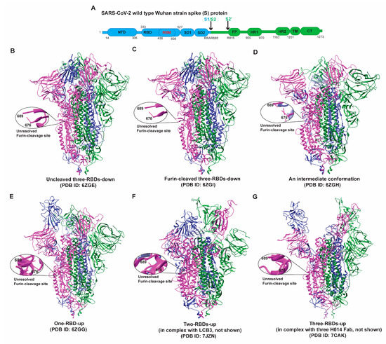 The domain organization and structures of a typical Spike protein in the pre-fusion states are depicted in Figure 1. Each S protomer can sample two primary conformations: “RBD-up” (“RBD” oriented up, hACE2-accessible) and “RBD-down” (RBD oriented down, hACE2-inaccessible) [26,27,43,46,50]. Consequently, the S trimer exhibits four major conformations: three/all-RBDs-down, one-RBD-up, two-RBDs-up, and three/all-RBDs-up (Figure 1). Un-cleaved and cleaved all-RBDs-down and an intermediate are hACE2-inaccessible states in which each S1 domain forms a V-shape structure with NTD at one side and CTD on another side, with RBD in the tip region in the homotrimer (Figure 1B–D) [37,38,39]. These structures make the NTDs lie in the periphery of the trimer and allow for establishing the interactions of all three NTDs with RBDs from the adjacent protomers. The S2 domains of three protomers form the helical bundle at the center of the trimeric structure. HR regions are then attached to the transmembrane domain and near the viral membrane. Of note, the furin cleavage site (682-RRAR-685) was not resolved in either the un-cleaved closed (Figure 1B, PDB ID 6ZGE) or the furin-cleaved, closed (Figure 1C, PDB ID 6ZGI) conformation. Interestingly, both structures (Figure 1B,C) exhibit very similar features at the atomic level without noticeable differences (structural alignment is shown in Figure S1).