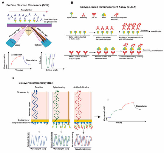 SPR is an optical technique in which one of the two interacting partners is immobilized on a gold sensor chip surface, and the other flows through a microfluidic system that encounters the chip surface. The SPR signal comes from changes in the refractive index at the surface of the gold sensor chip and is measured as the resonance angle. Once the flowing molecule in the microfluidic system binds the immobilized molecule on the sensor chip surface, the refractive index increases, recorded as a change in response, and this response signal is quantified in resonance units (RU). Monitoring the difference in the SPR signal (RU) over time produces a sensorgram, a plot of the binding response (RU) versus time which allows different stages of a binding event to be visualized and evaluated (Figure 2A) [90]. ELISA works on binding specific antibodies (or ligands) to the target antigen and generally uses HRP-conjugated or fluorescent protein-conjugated secondary antibodies to quantify antibody-antigen binding. Direct, indirect, sandwiched, or competitive ELISA techniques can be utilized to identify S-hACE2, S-antibody, or in general, S-ligand interactions, or competitive binding assays (Figure 2B) [91]. Like SPR, BLI is also an optical technique used to measure real-time interactions of the molecules (S-ligand) by analyzing interference patterns of white light reflected from the surface of a biosensor tip. In BLI, one interacting molecule is immobilized in the biosensor, and another remains in the solution. The change in the number of molecules bound to the end of the biosensor tip causes a shift in the interference pattern, which is then plotted as a graph (Figure 2C) [92]. At the cellular level, flow cytometry is widely used to analyze the binding of S protein to antibody or hACE2 [76]. Cells are transiently transfected with a plasmid expressing S or variants and a plasmid expressing a fluorescent protein. Then, 24–48 h post-transfection, cells are incubated with either antibody or hACE2 or both. Secondary antibodies with distinguishable fluorescent labels that are specific against antibody or hACE2 are then used for staining and flow cytometric analyses. This analysis yields the interactions between S and hACE2 or antibodies or inhibitors [76,93,94].