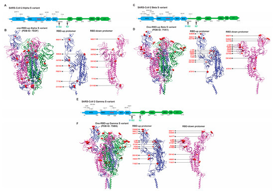 Accumulated mutations in the S early VOCs. (A,B) Amino acid substitutions are shown in the S domain organization (A) and depicted in the one-RBD-up structure (B) of the S Alpha variant (PDB ID 7EDF). Amino acid substitutions are highlighted in two different RBD-oriented protomers (RBD-up and RBD-down). The dotted lines indicate the mutated amino acid residues which are not resolved in the structure. (C,D) Illustrations as in (A) and (B), respectively, for the S Beta variant (PDB ID 7VX1). (E,F) Illustrations as in (A/C) and (B/D), respectively, for the S Gamma variant (PDB ID 7SBS).