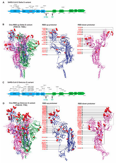 Accumulated mutations in the S Delta and Omicron variants. (A,B) Amino acid substitutions are shown in the S domains (A) and depicted in the one-RBD-up structure (B) of the S Delta variant (PDB ID 7SBL). Mutated amino acid residues are highlighted in the RBD-up and RBD-down protomers. The dotted lines indicate the mutated amino acid residues which are not resolved in the structure. (C,D) Illustrations as in (A,B), respectively, for the S Omicron variant (PDB ID 7TEI).