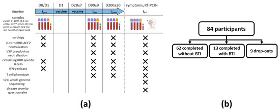 A schematic overview of the sampling procedure is shown in Figure 1a. No longer than 24 h before prime vaccination, a sampling moment was planned to establish a baseline immune profile (tpre). BNT162b2 administration was performed according to the recommendations of both the manufacturer and the Belgian Superior Health Council. A second sampling was performed three months (+/− 9 days) post prime vaccination (i.e., mid-term follow-up; t3m). For each participant, the last sampling was taken at 10 months (+/− 30 days) post prime vaccination (i.e., long-term follow-up test; t10m). In case a fully vaccinated participant (i.e., participant that received two doses of the BNT162b2 vaccine) presented with suggestive symptoms for SARS-CoV-2 infection (e.g., dry cough, fever and/or headache) or had a prolonged high-risk contact and also tested positive for SARS-CoV-2 via reverse transcriptase–polymerase chain reaction (RT-PCR), this participant was defined to have a BTI. In this setting, that specific participant was recalled for an additional sampling as soon as possible (tBTI). At tBTI, apart from venous blood (Figure 1a), a nasopharyngeal swab was also taken. Additionally, the participant was asked to fill in an in-house developed disease severity questionnaire (Supplementary Methods S1). Blinding was guaranteed by pseudonymization of all samples at any time.