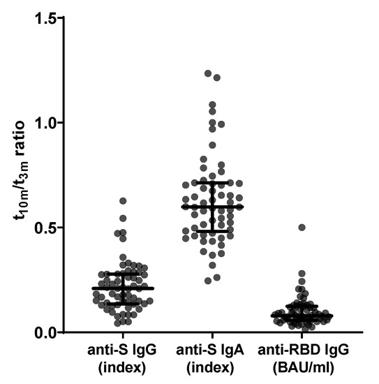 Firstly, for all 62 subjects, baseline titers for both anti-S IgG and anti-S IgA were below cut-off index values. Likewise, pre-vaccination anti-RBD IgG titers were undetectable (i.e., below assay-specific LOD). Interestingly, anti-S IgG, anti-S IgA and anti-RBD IgG titers all waned significantly (median t10m/t3m ratio: 0.21 ± 0.14 with p < 0.001; median t10m/t3m ratio: 0.60 ± 0.23 with p < 0.001; and median t10m/t3m ratio: 0.08 ± 0.07 with p < 0.0001, respectively) between t3m and t10m (Figure 2). Furthermore, 3, 15 and 30 participants had no quantifiable anti-S IgG, anti-S IgA and anti-RBD IgG titers, respectively, at t10m (data not shown). For both mid- and long-term follow-up, anti-S IgG, anti-S IgA and anti-RBD IgG antibody titers displayed significant correlation (Table 1—row 1–3 and Supplementary Figure S2).