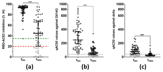 Next, functionality of the vaccine-induced antibodies was assessed via two methods. Firstly, the capacity of the antibodies to inhibit the interaction between ancestral Wuhan RBD and human ACE2 was assessed. Inhibition of the RBD–ACE2 interaction was below the assay-specific LOD at baseline but was clearly detectable in all but one subject at t3m with a median of 93 ± 11% IH. Binding inhibition attenuated significantly (p < 0.001) at t10m with a median of 44% IH and a Q1–Q3 interval of 20–68% IH. Moreover, 10 of the 62 participants showed borderline residual functionality and 14 subjects displayed no inhibition capacity anymore at t10m (Figure 3a). Secondly, neutralization activity against both the D614G (Figure 3b) and delta (Figure 3c) VoC was determined in a pseudovirus assay. Three months post-vaccination, all but two participants (3%) showed neutralization against D614G with a median qAC50 value of 255 ± 278. Already at this moment, 15 subjects (22%) showed no neutralization of the delta VoC while the overall median qAC50 value was106 ± 72 within the remaining subjects (78%). Furthermore, qAC50 values waned significantly between t3m and t10m with median values of 90 ± 78 for D614G and 50 ± 19 for delta, respectively. It is noteworthy that, at t10m, 18 (29%) and 45 (73%) healthcare workers had undetectable neutralization capacity against the D614G and delta VoCs, respectively. Although qAC50 values against D614G and delta VoCs correlated significantly with both anti-S IgG and anti-RBD IgG titers at t3m, qAC50 values against both VoCs were no longer significantly correlated with anti-RBD IgG values at t10m (Table 1—row 4–9 and Supplementary Figure S2). The degree of in vitro RBD–ACE2 binding inhibition (% IH) correlated significantly with qAC50 values against both D614G and delta VoCs at mid- and long-term follow-up (Table 1—row 10–11).