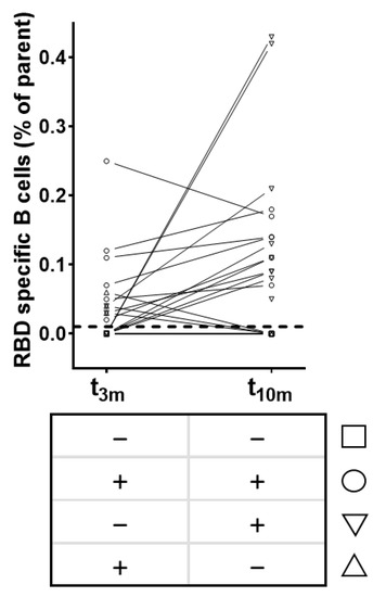 Patterns of circulating RBD-specific B cells after BNT162b2 vaccination (n = 23). Squares = subjects without RBD-specific B cells at both t3m and t10m. Upward triangles = subjects with RBD-specific B cells at t3m only. Downward triangles = subjects with RBD-specific B cells at t10m only. Circles = subjects with RBD-specific B cells at both t3m and t10m. Dashed line = assay-specific cut-off. Abbreviations: RBD = receptor-binding domain, parent = CD3−/CD19+/Zombie− cells, pre = baseline sampling moment before vaccination, 3m = 3 months after baseline, 10m = 10 months after baseline.