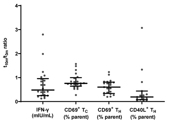 At all timepoints, a pronounced IFN-γ release was observed in the stimulation control condition for each sample (data not shown). Notably, SARS-CoV-2-specific IFN-γ release non-significantly decreased (p = 0.2113; data not shown) between 3 and 10 months post-vaccination with a median t10m/t3m ratio of 0.48 and a Q1–Q3 interval of 0.25–0.96 (Figure 5).
