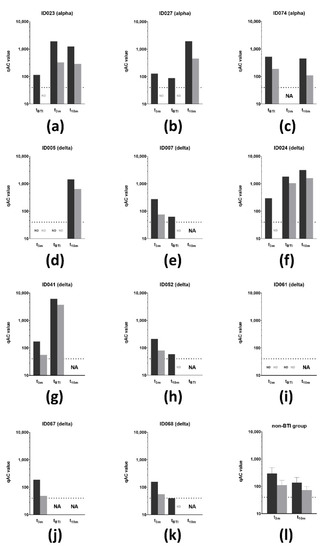 Finally, the VSV pseudovirus qAC50 values against both the D614G and delta VoCs were determined on all timepoints from the 11 affected individuals of which the causative SARS-CoV-2 VoC could be determined via RT-PCR (Figure 7a–l). At t3m, qAC50 values against D614G were non-significantly altered between the non-BTI and BTI group with mean qAC50 values of 298 ± 189 and 208 ± 64, respectively. However, the mean qAC50 value against delta was significantly lower (p < 0.05, Table 3) in the BTI group (63 ± 13) compared to the non-BTI group (111 ± 55). It is noteworthy that the latter mean qAC50 value only included results from non-BTI individuals who had detectable qAC50 values. All subjects that experienced BTI caused by the alpha VoC had detectable qAC50 values against D614G at time of infection (Figure 7a–c), while only two of the eight subjects with a delta BTI (ID024 and ID041) had remaining activity against the causative VoC at tBTI (Figure 7f,g).