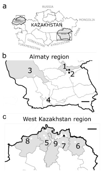 Geographical location of the sampling points for small mammals in Kazakhstan. (a): Kazakhstan is divided in 14 oblasts (=regions) and located in Central Asia. (b): Almaty region and Almaty city: 1. Tekeli city: 2 trapping sites; 2. village Rudniychniy: 1 trapping site; 3. village Bakanas: 1 trapping site; 4. Almaty city: 7 trapping sites; (c): West Kazakhstan region: 5. district Bayterek: 12 trapping sites; 6. district Borili: 1 trapping site; 7. district Terekti: 2 trapping sites; 8. district Taskala: 1 trapping site; 9. Oral city: 3 trapping sites. Sampling locations: white dots. Species and location of infected rodents: ● Microtus arvalis, ▲ Dryomys nitedula. Black frames = regions magnified in (b) and (c), size marker = 150 km.