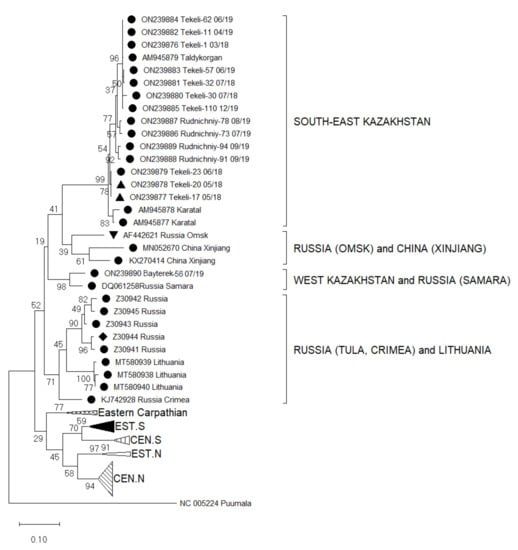 Phylogenetic analysis by Maximum Likelihood method of the S segments (346 nucleotides (nt), positions of sequences 715–1061 nt in regard to the reference sequence AM945879) of Tula virus in Kazakhstan. The tree with the highest log likelihood (−5756.38) is shown. The percentage of trees in which the associated taxa clustered together is shown next to the branches. This analysis involved 92 nucleotide sequences: Central North (CEN.N): KU139579, KU139576, KU139577, KU139578, DQ662094, HQ697346, HQ697344, HQ697347, HQ697351, GU300137, GU300136, EU439952, EU439947, EU439949, EU439948, EU439950, EU439946, EU439951, KU139534, KU139535, KU139537, KU139538, KU139598, KU139595, KU139596, KU139599, KU139529, KU139528, KU139531, KU139530, KU139533, DQ662087, DQ768143; Eastern North (EST.N): AF063897, AF289819, AF289820, AF289821; Central South (CEN.S): AF164093, HQ697350, HQ697348, HQ697349, HQ697355, HQ697353, HQ697354, HQ697357; Eastern South (EST.S): AJ223601, U95312, KF184327, KF184328, NC005227, Z69991, Z49915, Z48741, AJ223600, Z48574, KU139560; Eastern Carpathian: AF017659, Y13980, KF557547, Y13979; Russia Tula: Z30941, Z30942, Z30943, Z30944, Z30945; Russia Crimea: KJ742928; Lithuania: MT580938, MT580939, MT580940; Russia Samara: DQ061258; Russia Omsk: AF442621; China Xinjiang: MN052670, KX270414; South-East Kazakhstan: AM945877, AM945878, AM945879, outgroup Puumala NC005224. Host Species: ● Microtus arvalis, ▲ Dryomys nitedula, ♦ Microtus rossiaemeridionalis, ▼ Microtus gregalis.
