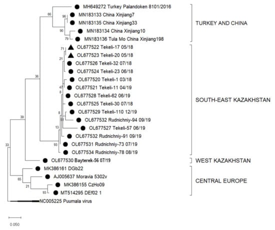 Phylogenetic analysis by Maximum Likelihood method of the L segments (184 nucleotides (nt), positions of sequences 5187–5371 nt in regard to the reference sequence NC005226) of Tula virus in Kazakhstan. The tree with the highest log likelihood (−1345.67) is shown. The percentage of trees in which the associated taxa clustered together is shown next to the branches. This analysis involved 25 nucleotide sequences: Turkey: MH649272; China: MN183133, MN183135, MN183134, MN183136; Europe: AJ005637, MK386161, MK386155, MT514295, outgroup Puumala NC005225. Host Species: ● Microtus arvalis, ▲ Dryomys nitedula..