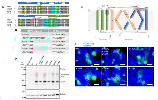 Inspection of the primary sequence of the human NTCP protein revealed a tyrosine-rich motif YIYSRGIY positioned between amino acids 139–146. Multiple sequence alignment analysis revealed that all three tyrosine residues of this motif, namely Y139, Y141, and Y146, are evolutionarily conserved among human NTCP, as well as chimpanzee, rhesus monkey, rat, and mouse Ntcps (Figure 1A). Based on the recent cryo-EM structures of human NTCP [,,], the 139YIYSRGIY146 motif is localized at the transition of transmembrane domain 4 to extracellular loop 2, and thereby is exposed to the extracellular surface of NTCP that is relevant for preS1-peptide binding (Figure 1B).