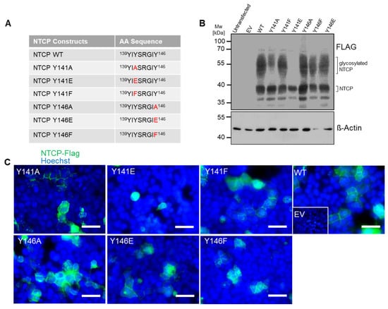 HEK293 cells grown in six-well plates were transiently transfected with NTCP-FLAG wt or the respective FLAG-tagged tyrosine mutant constructs. After 48 h, cells were washed with phosphate-buffered saline (PBS; 137 mM NaCl, 2.7 mM KCl, 1.5 mM KH2PO4, 7.3 mM Na2HPO4, pH 7.4) prior to being harvested in 500 µL lysis buffer consisting of 20 mM Tris-HCl, 135 mM NaCl, 10% glycerol (all above mentioned reagents from Carl Roth, Karlsruhe, Germany) and 1% Nonidet P40 (Fluka BioChemica, Schwerte, Germany). After centrifugation at 10,000× g for 10 min, the supernatants were collected and the amount of protein in each sample was determined using the BCA Protein Assay Kit (Novagen, St. Louis, MO, USA). Hundred µg of proteins were mixed with Laemmli sample buffer containing 2% SDS (Carl Roth, Karlsruhe, Germany), 10% glycerol (Carl Roth, Karlsruhe, Germany), 0.002% bromophenol blue (Merck, Darmstadt, Germany), 62.5 mM Tris-HCl (Carl Roth, Karlsruhe, Germany) and 5% 2-mercaptoethanol (Carl Roth, Karlsruhe, Germany) and heated at 95 °C for 10 min. Then, samples were separated on a 10% SDS polyacrylamide gel under reducing conditions, followed by electro-transfer to a Roti-PVDF membrane (Carl Roth, Karlsruhe, Germany). After blocking in TBS-T buffer (0.05% Tween-20 (Carl Roth, Karlsruhe, Germany) in PBS) containing 5% non-fat milk (Carl Roth, Karlsruhe, Germany), the membranes were probed with anti-FLAG rabbit polyclonal antibody (1:2000, Sigma-Aldrich, Hamburg, Germany, Cat. #F7425) overnight at 4 °C. Staining against beta-actin or GAPDH served as loading controls and were detected using a mouse anti-β-actin (1:1000, Sigma Aldrich, Cat. #A5441) or goat anti-GAPDH antibodies (1:1000, Sigma-Aldrich, Hamburg, Germany, Cat. #SAB2500450). Subsequently, the membranes were incubated with peroxidase-labelled anti-rabbit and anti-mouse goat secondary antibodies (1:3000, all from Thermo Fisher Scientific, Waltham, MA, USA; Cat. #31460, #31430, and #31431, respectively). Membranes were finally incubated with the ECL Plus Kit (Amersham Biosciences, Buckinghamshire, UK) and signal was acquired using the ChemiDoc Image System and Image Lab software (Bio-Rad Laboratories, Hercules, CA, USA).