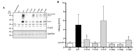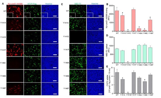 3.4. NTCP Y141E, Y146A and Y146E Mutations Protect against In Vitro HBV Infection
