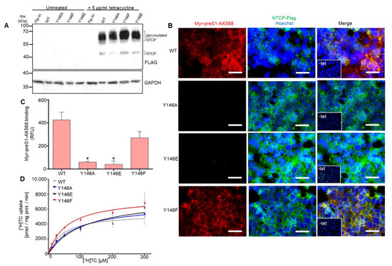 T-Rex Flp-In HEK293T cells (Thermo Fisher Scientific, Waltham, Massachusetts, USA) were used to generate stably transfected tetracycline inducible NTCP-FLAG cell lines as described []. Briefly, pcDNA5/FRT/TO wild-type (wt) NTCP, as well as Y146A, Y146E, and Y146F NTCP mutant constructs were co-transfected with the Flp recombinase coding plasmid pOG44 (Invitrogen, Carlsbad, CA, USA). Stable integration of the expression plasmid was achieved through homologous recombination at the Flp recombinase target (FRT) site in the plasmid and cell genome. Stable cell clones were selected for hygromycin (150 µg/mL) resistance for several weeks. The parental cell line and all stable cell clones were maintained at 37 °C, 5% CO2, and 95% humidity in DMEM/F-12 medium (PAA, Pasching, Germany) supplemented with 10% fetal calf serum, 4 mM L-glutamine (PAA, Pasching, Germany) and penicillin/streptomycin (PAA, Pasching, Germany). Proper integration of the NTCP mutant constructs into the HEK293 cell genome was verified by Sanger sequencing (Microsynth AG, Balgach, Switzerland).