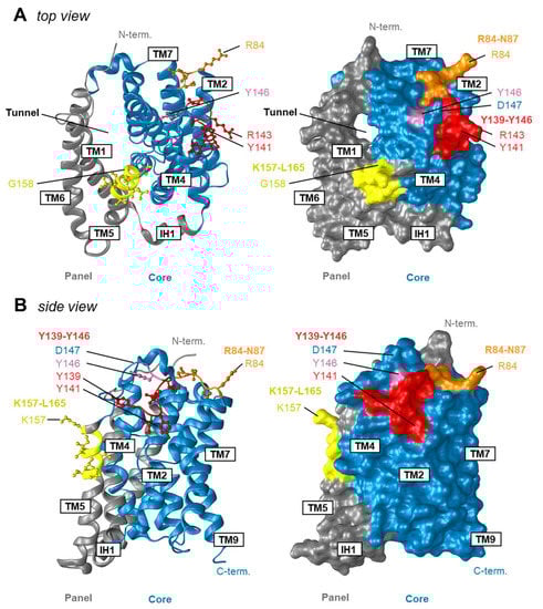 Protein surface-exposed regions of NTCP play an essential role during initial docking of HBV to hepatocytes []. Until now, only few such motifs have been identified and characterized giving prerequisites for the prediction of preS1-NTCP interactions taking place upon HBV infection [,,]. It seems that different NTCP motifs are required for high-affinity virus binding and entry into hepatocytes, such as 84RLKN87, 157KGIVISLVL165, S267, and N5/N11 [,,]. According to recent NTCP models, the protein possesses nine transmembrane helices, which are arranged into a “core” domain composed of TMDs II, III, IV, VII, VIII, and IX, and a “panel” domain comprised of TMDs I, V and VI (Figure 1B and Figure 7A,B). The newly identified 139YIYSRGIY146 is part of the second extracellular loop linking TMD IV and TMD V [,,,,,,]. Therefore, the Y146 residue lies near previously identified sequences required for HBV tropism, namely 157KGIVISLVL165 and 84RLKN87, which are located in the TMD V, and in the first extracellular loop between TMD II and TMD III, respectively [,,,]. Their close proximity and protein surface localization suggest a joint contribution to virus binding. Since the Y146-containing extracellular loop connects TMD IV and TMD V, thereby bridging the “core” and “panel” domains of NTCP [,,,], it was proposed that a movement of the more flexible “panel” domain (TMD I, V, VI) against the more rigid “core” domain (TMD II–IV and VII–IX) facilitates bile acid transport of NTCP [,,,,,]. Consequently, any mutation in the 139YIYSRGIY146-connecting loop of these two domains should significantly affect protein structure and conformation. Subsequently, this could result in abnormal transporter function. Surprisingly, except for the “loss-of function” Y141E variant, all other tested NTCP mutants, including 143K (data not shown), were capable of transporting TC into the HEK293 cells, suggesting that the 139YIYSRGIY146 motif is irrelevant for the transporter function of NTCP. Therefore, the second extracellular loop of NTCP, especially the fragment comprised of Y141 and Y146, could be a potential target for the development of NTCP-based entry inhibitors, which would not disrupt the enterohepatic circulation of bile acid in humans.