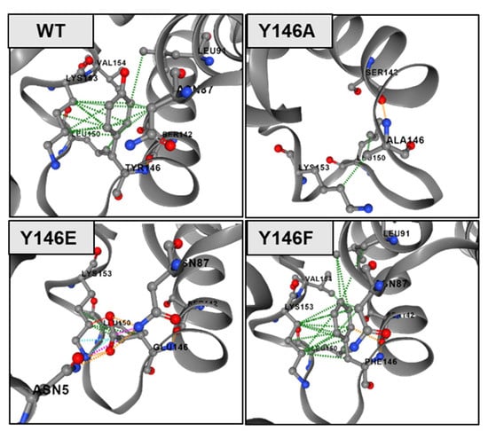 In mutation studies, effects of loss-of-function mutants are often difficult to interpret, as even single amino acid mutations can destabilize a protein in a way that ligand or substrate binding is no longer possible. However, there is, of course, also the possibility for a direct interaction of a particular amino acid residue with the above-mentioned molecules so that a loss of function phenotype can be explained by lack of a specific interaction site. In the case of the Y141E NTCP mutant, in the present study, this mutation seems to destabilize the NTCP protein in a way that means sufficient protein expression and sorting to the plasma membrane is not possible. Consequently, this mutant is no longer active in bile acid transport and myr-preS1-AX568 peptide binding (Figure 3B,C, and Figure 4A,C). In contrast, all other mutants showed fully active bile acid transport functions, clearly indicating that the respective mutations did not affect protein expression and stability, as well as protein flexibility, that are important to execute conformational changes during the transport cycle. Nevertheless, it cannot be excluded that, even if bile acids and myr-preS1 peptide binding to NTCP significantly interfere with each other [,], a mutation might destabilize the NTCP protein in a way that only myr-preS1 peptide binding is affected, but not bile acid transport. Considering this, it is interesting to note that the NTCP Y141F mutant retained the same full transport and virus receptor function as the wt NTCP, indicating that the hydroxyl group of the tyrosine at amino acid position 141 is neither involved in the binding of the bile acid nor of the myr-preS1 peptide. This fits quite well with the localization of Y141 within the recently resolved NTCP structure, where this tyrosine residue is clearly oriented away from the domains relevant for substrate and preS1 binding (Figure 7A,B). Nevertheless, the aromatic ring at this amino acid position seems to be important for the conformation and stability of the NTCP protein. Accordingly, substitution of tyrosine with alanine at position 141 seems to change the structure of the whole NTCP protein in a way that bile acid transport (Figure 4E), myr-preS1-AX568 peptide binding (Figure 4B), and in vitro HBV infection (Figure 6B) are reduced. The situation was somewhat different for mutations at amino acid position Y146. The tyrosine residue Y146 seems to form significant hydrophobic interactions with the adjacent lysine 153 (K153) and asparagine 87 (N87) residues, at least based on the AlphaFold-derived NTCP model (Figure 8). Here, Y146 is located exactly at a bridge region connecting the K157-L165 and R84-N87 motifs that were previously identified as relevant regions for HBV/HDV virus binding to NTCP (Figure 7A,B). This might explain why mutation of Y146 to alanine, possibly abolishing the K153-Y146-N87 hydrophobic interaction axis, comes with a loss of myr-preS1 peptide binding phenotype (Figure 8, panel WT vs. Y146A). Interestingly, the hydroxyl group of tyrosine 146 seems to make no interaction with any of the surrounding amino acid residues, suggesting that the Y146F mutation does not affect stability and folding of the NTCP protein. This is supported by the fact that the transport kinetics for TC are nearly identical to those for the wt NTCP and the Y146F mutant (Figure 5C). However, we demonstrated markedly lower binding of the myr-preS1-AX568 peptide to the Y146F mutant (Figure 4B) compared to wt NTCP and, as a consequence, significantly reduced rates for in vitro HBV infection (Figure 6B). Overall, this might indicate that the hydroxyl group of the tyrosine 146 residue is directly involved in the interaction with the myr-preS1 peptide, probably via hydrogen bonding. However, additional studies are needed to analyze the contribution of these non-covalent interactions of Y146 to the preS1 binding activity of NTCP upon HBV infection.