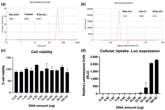 Uptake and the subsequent cellular immune responses that are generated is influenced by the size of the nanoparticle (NP) vaccines [20]. Plasmid DNA encoding for the SARS-CoV-2 spike glycoprotein (pCoV-S) was used for size and charge characterization. QAC complexation of pCoV-S that was suitable for mice inoculation led (pQAC-S) to the formation of nanoparticles around 400 nm using a dynamic light scattering (DLS) analysis post-sonication for disaggregation with a net-positive zeta potential of −51.9 ± 4.58 mV (Figure 1a,b). To evaluate the biocompatibility of QAC-based vaccines in a relevant cell culture model for SARS-CoV-2 vaccines, different amounts of QAC-encapsulated pCAG vector encoding the luciferase gene (pQAC-Luc) was added to HEK 293T cells, and cell viability after 3 days was measured using MTT assay. As expected, no cytotoxicity was observed in the cells post-pQAC-Luc addition even at high DNA amounts, highlighting the safety of QAC-based vaccines (Figure 1c). To quantitatively determine the delivery of cargo plasmid, pQAC-Luc was added to HEK 293T cells in increasing amounts and luciferase expression was assayed 3 days post-addition. The luciferase expression was detected in a dose-dependent manner, indicating the delivery and expression of luciferase from the packaged construct (Figure 1d). The release kinetics of plasmid DNA from pQAC-Luc was evaluated in phosphate-buffered saline (PBS) at physiological temperature (37 °C) and pH (7.4) by quantifying the amount of DNA that was released over time using spectrophotometry. Close to 15% of the packaged pCAG-Luc was released over 24 days in a sustained manner (Figure 1e). To further confirm that the released DNA was functional, pCAG-Luc that was released 24 h after incubation was used to transfect HEK 293T cells with a standard transfection reagent. No difference in luciferase expression was observed between control fresh pCAG-Luc and released pCAG-Luc (Figure 1f). These results underscore the ability of the QAC adjuvant system to release functional and stable plasmid DNA.
