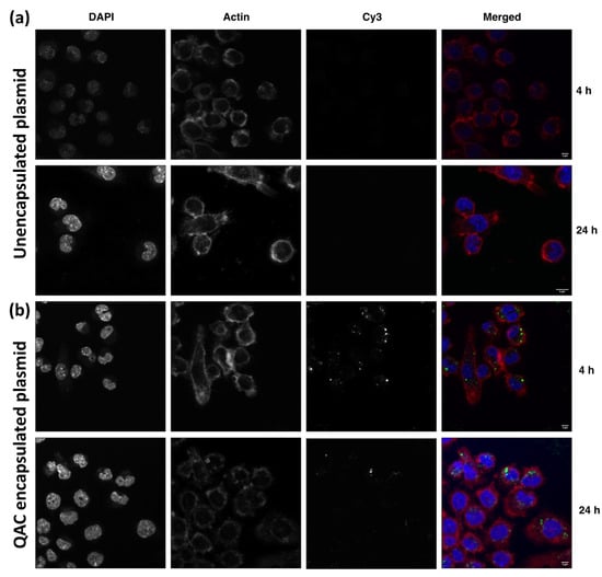Efficient internalization of QAC nanoparticles by J774 cells. Cell monolayers were incubated with Cy3-labeled (a) unencapsulated or (b) QAC encapsulated labeled DNA (green) for 4 or 24 h and stained for actin (Alexa phalloidin 546, red). DAPI (blue) was used to stain the nucleus. Representative images were captured by LSCM. Scale bars = 5 μm.