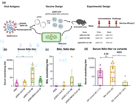 Groups of K18-hACE2 mice were immunized with QAC-complexed plasmid DNA (pCoV-S and pCoV-N, both termed pQAC-CoV) via IN or IM routes, followed by boosting at 6 weeks post-initial immunization (Figure 3a). The pQAC-CoV parenteral (IM) administration led to the significant induction of SARS-CoV-2 neutralizing antibody titers (nAb) in harvested sera at 3 weeks post-final vaccination (wpv, Figure 3b). The neutralizing antibody levels were also higher with heterologous vaccination where mice were primed by pQAC-CoV IN, followed by MVA-CoV IN administration (pQAC/MVA-CoV) as reported previously, albeit non-significant (Figure 3b). Interestingly, bronchoalveolar lavage (BAL) that was harvested from pQAC-CoV IM-vaccinated mice was able to neutralize SARS-CoV-2 at levels higher than detected with the unvaccinated group (Figure 3c). The ability of sera from pQAC-CoV IM-vaccinated mice to neutralize common circulating variants of SARS-CoV-2, B.1.1.7 and B.1.351 was investigated. Neutralization titers against B.1.1.7 showed no significant difference when compared to the SARS-CoV-2 lineage A virus against which the vaccines are developed (Figure 3d). In contrast, neutralization titers against B.1.351 were non-detectable and significantly lower, an observation also seen with other approved COVID-19 vaccines (Figure 3d). Our results suggest that parenteral (IM) QAC based-immunization is better at inducing significant systemic serum-neutralizing immune responses than local, IN immunization.