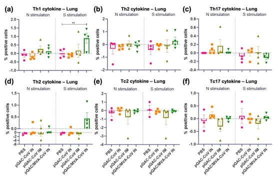 SARS-CoV-2 spike-specific T-cell responses in lungs of vaccinated K18-hACE2 mice. Intracellular cytokine staining was performed on lungs harvested 3 weeks after final boost to assess T-cell responses. (a) Type 1 helper (Th1) responses (IFN-γ or TNFα or IL-2+); (b) type 2 helper (Th2) responses (IL-13+); (c) type 17 helper (Th17) responses (IL-17+); (d) type 1 cytotoxic (Tc1) responses (IFN-γ or TNFα or IL-2+); (e) type 2 cytotoxic (Tc2) responses (IL-13+); (f) type 17 cytotoxic (Tc17) responses (IL-17+) intracellular cytokine staining assays for lung T-cells in response to recombinant SARS-CoV-2 spike stimulation. Significance (**, p < 0.01) was determined by ANOVA compared to PBS controls. Data show mean ± SEM.