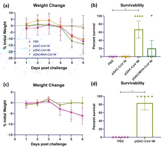 Protective efficacy of QAC-based SARS-CoV-2 vaccines in K18-hACE2 mice. Three weeks following final immunization, K18-hACE2 mice were intranasally infected with 1 × 104 PFU of SARS-CoV-2. (a,c) Weight loss and (b,d) survival outcomes at 6 days post-challenge (dpc) in K18-hACE2 transgenic mice. Data from follow-up trial depicted in c and d. Weight loss data show median with error (95% CI). Survivability significance (*, p < 0.05) was determined by Mantel–Cox log rank test. Survivability data show mean ± SEM.