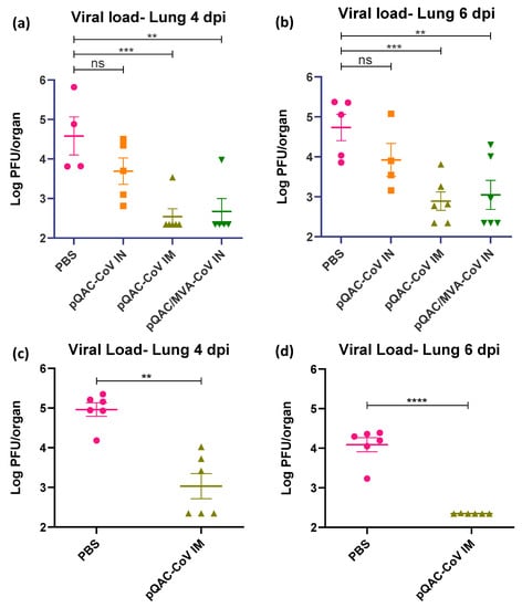 pQAC-CoV administration reduces lung tissue titer. SARS-CoV-2 titers in the lungs of vaccinated mice at 4 (a,c) and 6 (b,d) days post-infection (dpi). Data from follow-up trial depicted in (c,d). Significance (**, p < 0.01; ***, p < 0.001; ****, p < 0.0001) or non-significance (ns) was determined by ANOVA compared to PBS controls (a,b) or Student’s t-test (c,d). Data show mean ± SEM.