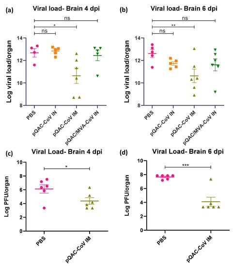 The ability of the experimental QAC-based vaccines to protect K18-hACE2 transgenic mice against SARS-CoV-2 challenge was investigated. Three weeks post-final vaccination, all vaccinated and control (PBS) mice were challenged with a lethal dose of SARS-CoV-2, isolate USA-WA1/2020 (104 pfu/animal) intranasally, against which the vaccines were developed. A follow-up study was conducted with only the PBS and pQAC-CoV IM vaccinations for reproducibility and to validate the findings of the first trial. The outputs from the follow-up trial are depicted in (c,d) of Figure 5, Figure 6 and Figure 7. The unvaccinated mice started losing weight at 4 days post-challenge (dpc) with all mice meeting the criteria for euthanasia by 6 dpc (Figure 5a,c). In contrast, a majority of the pQAC-CoV IM-administered mice (65–80%) survived and showed no apparent clinical signs of SARS-CoV-2 infection with no weight loss (Figure 5b,d). pQAC/MVA-CoV that was administered via the IN route offered minimal protection with significant weight loss observed, comparable to the PBS group, and only 20% of the mice survived at the experimental end point (Figure 5b,d). The mice that were vaccinated with pQAC-CoV IN offered no protection with all the mice following a similar clinical trajectory to the unvaccinated mice (Figure 5a,b). We quantified the infectious viral load in the lungs and brains of challenged mice at two different time points, 4 and 6 dpc. A significant reduction in the lung viral load of both pQAC-CoV IM and pQAC/MVA-CoV IN-vaccinated mice when compared to the unvaccinated mice was observed across both time points (Figure 6a–d). In contrast, only the pQAC-CoV IM vaccinated mice had significantly lower viral RNA and infectious viral loads in the brain (Figure 7a–d). In agreement with the immunology findings, we did not see any significant reduction in the viral loads of pQAC-CoV IN-administered mice both in the lungs and brain (Figure 6 and Figure 7). The parenteral administration of pQAC-CoV which induces significant systemic immune responses provided better protection in transgenic mice when compared to both the mucosal vaccine administrations.