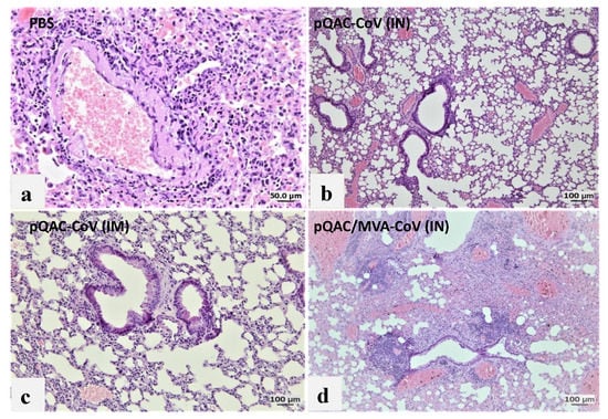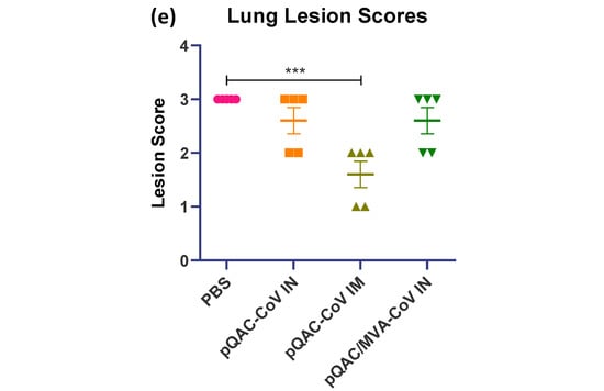 To further examine the efficacy of the different experimental vaccines, hematoxylin and eosin (H&E) staining of lung, spleen and brain sections from vaccinated mice at 6 dpc was conducted and histopathological changes were examined in a blinded fashion. Examinations of lungs from unvaccinated mice showed 75% of lung involvement with robust aggregates forming circumferential perivascular lymphoid cuffs and compression of adjacent parenchyma. Furthermore, severe interstitial pneumonia appeared marked as evidenced by mononuclear cells infiltrated the interstitial tissue septa and lumen with consolidation and atelectasis (Figure 8a). Examination of lungs from pQAC-CoV IN-vaccinated mice revealed 25% of lung involvement with a moderate degree of interstitial pneumonia (Figure 8b). In contrast, the pQAC-CoV IM-vaccinated group reported very mild lungs lesions in comparison to the unvaccinated mice with only 10% of lung involvement in the form of very few perivascular solitary lymphoid cell aggregates and mild interstitial pneumonia (Figure 8c). Examination of lungs from the pQAC/MVA-CoV IN-vaccinated group denoted 50% of lung involvement with perivascular lymphoid cuffing, together with less severe interstitial pneumonia than the unvaccinated group (Figure 8d). To quantify the difference in lung severity, the interstitial inflammatory response in each lung sample was scored, including lymphocytic infiltration, extension into the airspaces, and associated edema and atelectasis [19]. As shown in Figure 8e, the pQAC-CoV IM-vaccinated mice showed the least sign of interstitial inflammatory response at 6 dpc. Similar pathology results were noted in the organs of vaccinated mice with few splenic and brain lesions and minimum tissue damage in comparison to the unvaccinated mice (data not shown), which correlates well with the clinical outcome and viral load data. Overall, our analysis indicates that tissue damage was significantly less in mice that were administered the pQAC-CoV via the IM route in comparison to IN vaccination.