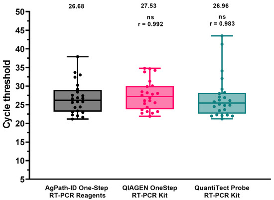 Performance comparison of different amplification kits. Dots represent individual Ct values. Mean Ct and Spearman’s rank correlation coefficient (r) are reported. ns: not significant.