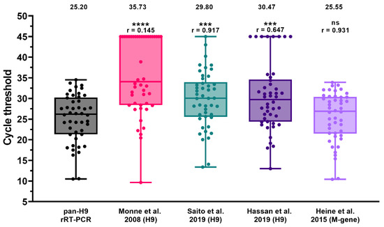 Diagnostic sensitivity of the pan-H9 rRT-PCR compared to M-gene screening rRT-PCR (Heine et al., 2015) [60] and three existing H9 detection methods [29,48,52]. Dots represent individual Ct values. Negative samples were arbitrarily assigned a value of 45. Mean Ct and Spearman’s rank correlation coefficient (r) are reported. **** p < 0.0001; *** p < 0.0002; ns: not significant.
