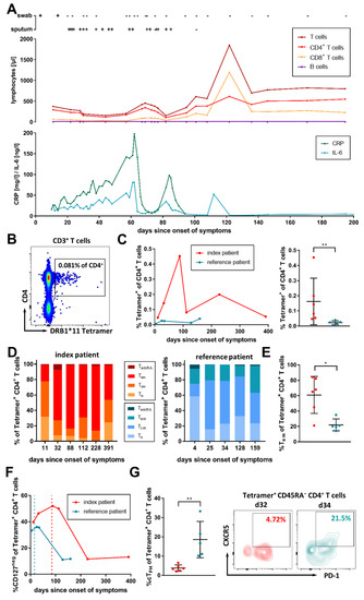 Clinical course and kinetics of Tetramer+ SARS-CoV-2-specific CD4+ T-cells. (A) PCR results for SARS-CoV-2 from nasopharyngeal swabs and sputum are shown as “+” for a positive and “−“ for a negative test result. Overview of the lymphocytes (B- and T-cells) and inflammatory blood markers CRP [mg/L] and IL-6 [ng/L] during the infection of the index patient are depicted. (B) Representative flow cytometry plot of DRB1*11 Tetramer staining of PBMC from the index patient on day 112 after the onset of symptoms. Shown are living CD3+ T-cells. (C) The frequencies of Tetramer+ CD4+ T-cells in the peripheral blood of the index patient (red) and a reference patient (blue) are depicted longitudinally (left), and pooled for each patient (right). (D) Comparison of the proportions of naïve (Tn; CCR7+ CD45RA+), central memory (Tcm; CCR7+ CD45RA−), effector memory (Tem; CCR7− CD45RA−), and late effector memory (TemRA; CCR7− CD45RA+) T-cells between the index patient (red) and the reference patient (blue) among the SARS-CoV-2-specific T-cells. (E) The index patient showed cumulatively increased frequencies of SARS-CoV-2-specific CD4+ T-cells with a Tem phenotype. (F) Development of IL7Rα (CD127) negative SARS-CoV-2-specific effector CD4+ T-cells of the index (red) and the reference patient (blue). Dotted lines indicate the last positive PCR result. (G) The index patient showed cumulatively reduced frequencies of SARS-CoV-2-specific CD4+ T-cells with a circulating T follicular helper cell (cTFH) phenotype. Shown are representative flow cytometry plots for both patients from day 32 (index patient; red) or day 34 (reference patient; blue). In cumulative analyses, data are depicted as mean with SD, and for statistical testing, a Mann–Whitney test was performed. Results were considered statistically significant if p < 0.05. Levels of significance are translated to asterisks as follows: * p < 0.05; ** p < 0.01.