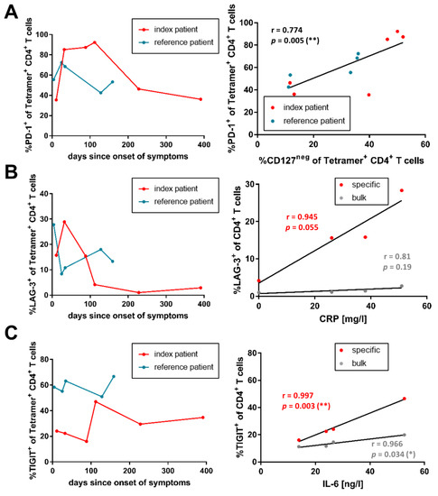 As described previously [50], an increase in LAG-3+ bulk CD4+ T-cells to a maximum of 2.77% (index patient, day 32) and 2.64% (reference patient, day 4), compared to healthy individuals (median 1.07%, IQR 0.86–1.62%), could be observed during the acute infection (Figure S4B). LAG-3+ frequencies decreased again afterward. With 28.9% and 27.8%, respectively, a more marked increase was visible in the specific CD4+ T-cells of both the index and the reference patient (Figure 2B). For the index patient, the frequency of virus-specific LAG-3+ CD4+ T-cells showed a non-significant association (r = 0.945; p = 0.055) with the available CRP levels.