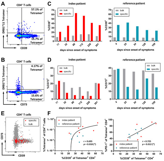 The expression of CD73 also differed markedly on bulk CD4+ T-cells. The index patient showed around a 2-fold lower frequency of CD73+ CD4+ T-cells (mean 16.93%, range 10.1–21.8%), as compared to the reference patient (mean 36.16%, range 32.6–38.8%) (Figure 3D) and healthy controls (median 32.7%, IQR 23.2–41.4%). Despite this, the general trend of the CD73+ subset of the SARS-CoV-2-specific CD4+ T-cells in the index patient closely resembled the trend in the reference patient. The frequency of CD73+ SARS-CoV-2-specific CD4+ T-cells initially decreased from levels similar to the bulk CD4+ T-cells to a minimum of 4.17% in the index patient and 12.42% in the reference patient. Towards the later stages of the disease, the frequency of CD73+ virus-specific CD4+ T-cells recovered to levels similar to the bulk CD4+ T-cell compartment. Generally, SARS-CoV-2-specific CD4+ T-cells expressed CD39 instead of CD73 (Figure 3E). While the frequencies of virus-specific CD73+ CD4+ T-cells did not show any association with clinical data (data not shown), the frequency of specific CD39+ CD4+ T-cells could be significantly correlated with the overall frequency of specific CD4+ T-cells (r = 0.695; p = 0.018) and the frequency of PD-1+ virus-specific CD4+ T-cells (r = 0.725; p = 0.012) (Figure 3F). Despite this, the co-expression of CD39 with PD-1 was highly variable (data not shown).
