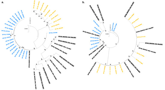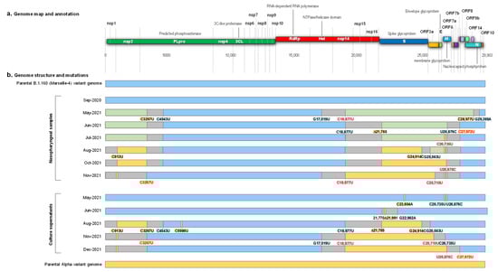 Phylogenetic analyses based on SARS-CoV-2 genomes (a) and spike gene sequences (b). Sequences obtained from the case-patient are indicated by a grey background, and those obtained from cultures are underlined. Other sequences from our SARS-CoV-2 sequence database are indicated by a blue font when classified as of the B.1.160 variant, and by a yellow font when classified as of the Alpha variant. Sequences are labeled with their GISAID (https://www.gisaid.org/; accessed on 18 May 2022) [34] identifiers. Trees are rooted with the genome of the Wuhan-Hu-1 isolate GenBank accession no. NC_045512.2.2.3. Genome of the initial virus.