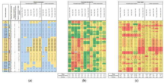 Majority nucleotides (a) nucleotide diversity (b) and sequencing depth (c) for sequences obtained from the respiratory samples and the culture supernatant at nucleotide positions of the SARS-CoV-2 genome that harbor signature mutations of the B.1.160 or Alpha variants. Del, nucleotide deletion. Nucleotide positions are in reference to the genome of the Wuhan-Hu-1 isolate GenBank accession no. NC_045512.2. (b) Nucleotide diversity is the proportion of sequence reads that do not harbor the consensus (majority) nucleotide. (c) Read depth is the number of reads covering a given nucleotide position.