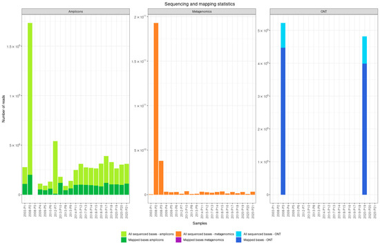 Sequencing and mapping statistics for clinical samples sequenced with amplicon-based and shotgun metagenomic sequencing on Illumina and Oxford Nanopore Technologies platforms. Note the difference in scales on Y axes between the approaches due to difference in number of generated reads.