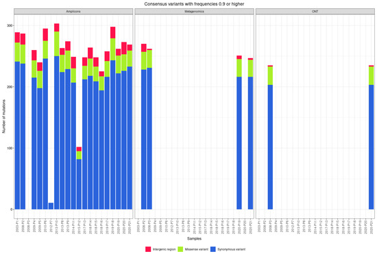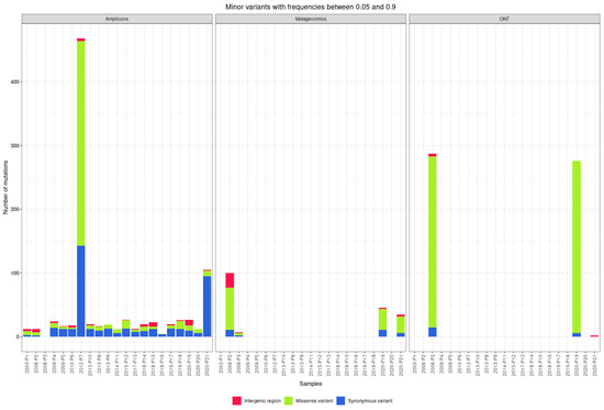 The median number of mutations found in the genome using the amplicon-based approach is 12 synonymous variants, 4 missense variants, 1.5 variants in untranslated regions, and 2 frameshift variants. Of the 526 frameshift variants found in the amplicon-based approach, 489 were found in two genomes sequenced using ONT, with a median of 238 frameshift variants per genome (Figure 5).