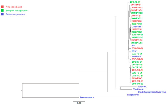 Twenty-seven consensus sequences generated in this study and selected reference sequences from the NCBI nucleotide databases were aligned using MUSCLE algorithm v3.8.424 [40] in AliView program [41]. Resulted multiple sequence alignment was used for phylogenetic tree building using program IQ-TREE v 2.1.2 with settings “-m MFP -bb 1000 -bnni -nt AUTO -alrt 1000-abayes” [42,43,44]. Phylogenetic tree was drawn with program FigTree v. 1.4.4 [45]. Selected reference sequences from the NCBI database were TBEV-Eu strain Ljubljana I (JQ654701.1), TBEV-Eu Neudoerfl (U27495.1), TBEV-Eu Hypr (U39292.1), TBEV-Eu 262 (U27491.1), TBEV-FE strain Sofjin-HO (AB062064.1), TBEV-Sib strain Vasilchenko (L40361.3), Omsk hemorrhagic fever virus strain Bogoluvovska (AY193805.1), Langat virus strain TP21 (AF253419.1) and Powassan virus (NC_003687.1)