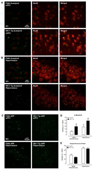 Animals (HIV-1 Tg: male, n = 4; female, n = 4; F344/N Control: male, n = 4; female, n = 4) were deeply anesthetized using sevoflurane (Abbot Laboratories, North Chicago, IL, USA) and transcardially perfused with 4% paraformaldehyde. After perfusion, brains were removed, post-fixed overnight in 4% chilled paraformaldehyde, and sectioned using a vibratome (100 µm thick coronal slices). Brain sections were incubated with either the Alexa Fluor® 488 anti-beta Amyloid 1-42 rabbit monoclonal antibody (Cat. No. ab224026, Abcam, Waltham, MA, USA), Alexa Fluor® 594 anti-NeuN rabbit monoclonal antibody (Cat. No. ab207279, Abcam, Waltham, MA, USA), or anti-Amyloid Precursor Protein rabbit monoclonal antibody (Cat. No. ab208744, Abcam, Waltham, MA, USA). Fluorescent images were acquired using a Nikon D-Eclipse C1 inverted fluorescence microscope. Analyses were conducted by evaluating the intensity of immunohistochemistry (IHC) staining using NIS-Elements BR3.10 software (Nikon, Melville, NY, USA), whereby the experimenter was blind to both genotype and sex.