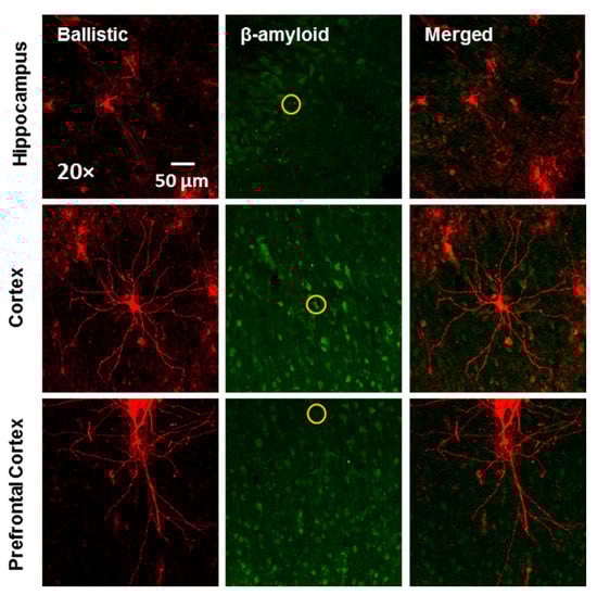 Co-localization of DiOlistically labeled neurons and β-amyloid immunostaining in the hippocampus, cortex, and prefrontal cortex. The yellow circle indicated the DiOlistically labeled neuron co-localizing with β-amyloid immunostaining positive signal.