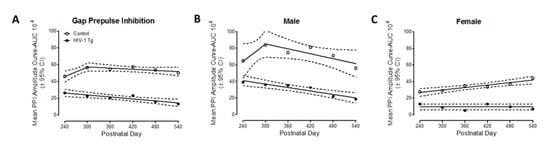 In gap-PPI, the area of the inflection of the ASR response curve (a measure of prepulse inhibition), was utilized to examine the progression of temporal processing in HIV-1 Tg and control rats from PD 240 to PD 540 (Figure 3). HIV-1 Tg animals, relative to controls, displayed a prominent alteration in the progression of temporal processing (Figure 3A). For control animals, a segmental linear regression provided a well-described fit, with a linear increase in maximal prepulse inhibition observed through approximately PD 300, followed by a subsequent decline (R2 = 0.85). In sharp contrast, a first-order polynomial with a negative slope (i.e., β1 = −392.9 ± 239.6 (X ± 95% confidence interval)) provided a well-described fit for HIV-1 Tg rats (R2 = 0.83). The magnitude of alterations in the progression of temporal processing, however, was significantly influenced by the factor of biological sex (Figure 3B,C).