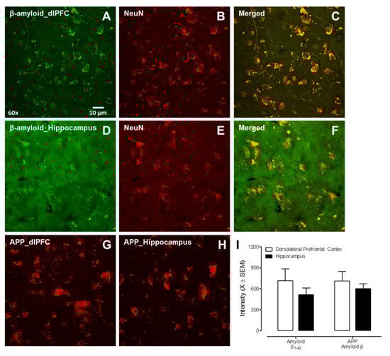 β-amyloid accumulation in the dorsolateral PFC (dlPFC) and hippocampal dentate gyrus from human autopsy HIV-infected cases with HAND. (A–F) Representative images of double staining of β-amyloid with NeuN (a neuronal marker) in the dlPFC (A–C), and in the hippocampus from human autopsy (D–F). (G,H) Confocal images of amyloid precursor protein expression in the dlPFC and hippocampus. (I) Quantification of β-amyloid and amyloid precursor protein expression in the dlPFC and hippocampus.