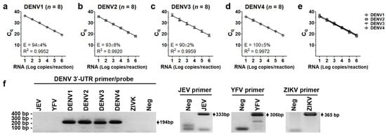 Limit of detection (LoD), limit of quantification (LoQ), and PCR amplification efficiency of each primer/probe were analyzed by using in vitro transcribed DENV RNA as a template. The PCR efficiency equation was as follows.