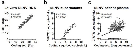 Levels of DENV genome measured by both assays provided high correlation (R > 0.9 and p < 0.0001) when DENV RNA (Figure 2a) or cultured DENV (Figure 2b) was used as the RNA template, but the correlation decreased (R = 0.5483 and p < 0.0001) when measured in patients’ plasma (Figure 2c). Interestingly, in both cultured virus and patient plasma (Figure 2b,c), the levels of the DENV genome measured by 3′-UTR RT-PCR were less than the DENV genome measured by targeting the coding sequences and, noticeably, some were detected by only coding sequences (X-axis) or 3′-UTR (Y-axis).